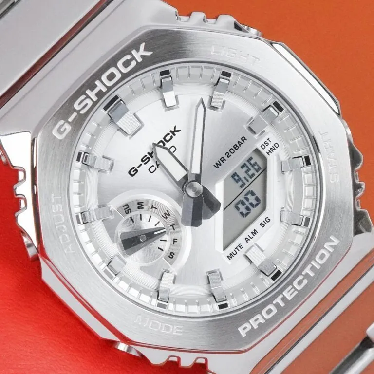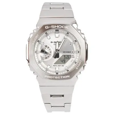 Khác với những phiên bản vỏ nhựa truyền thống, Đồng hồ Casio Nam GM-2110D-7ADR gây ấn tượng mạnh ngay từ cái nhìn đầu tiên bởi lớp "giáp" thép không gỉ sáng bóng. Toàn bộ phần bezel và dây đeo đều được chế tác từ kim loại, tạo nên một trọng lượng đầm tay và cảm giác sang trọng vượt trội.