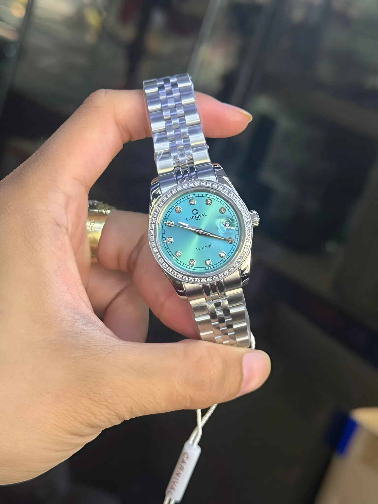 Sự kết hợp giữa mặt xanh và vành Bezel khảm đá quý nhân tạo là một bước đi đầy tinh tế của nhà Carnival. Những viên đá được tuyển chọn kỹ lưỡng, xếp đều tăm tắp xung quanh mặt số, tạo nên hiệu ứng bắt sáng tuyệt vời mỗi khi bạn cử động tay.