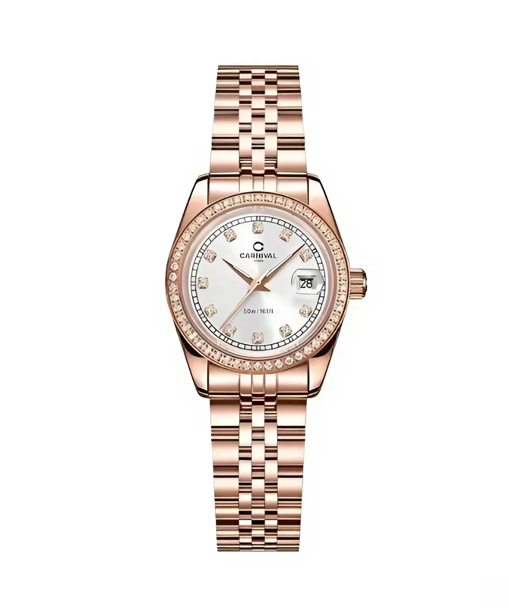 Màu sắc là linh hồn của phụ kiện, và Đồng Hồ Carnival 32mm Nữ 8131L2-VH-T đã chọn cho mình sắc vàng hồng (Rose Gold) cực kỳ thời thượng. Lớp vỏ và dây đeo được xử lý bằng công nghệ mạ PVD tiên tiến, giúp màu sắc có độ sâu, độ bóng gương hoàn hảo và đặc biệt là độ bền màu theo thời gian. Tôi tin rằng, tông màu vàng hồng này không hề kén da, dù bạn sở hữu làn da trắng sáng hay làn da mật ong khỏe khoắn, chiếc đồng hồ này vẫn luôn biết cách làm bạn nổi bật.