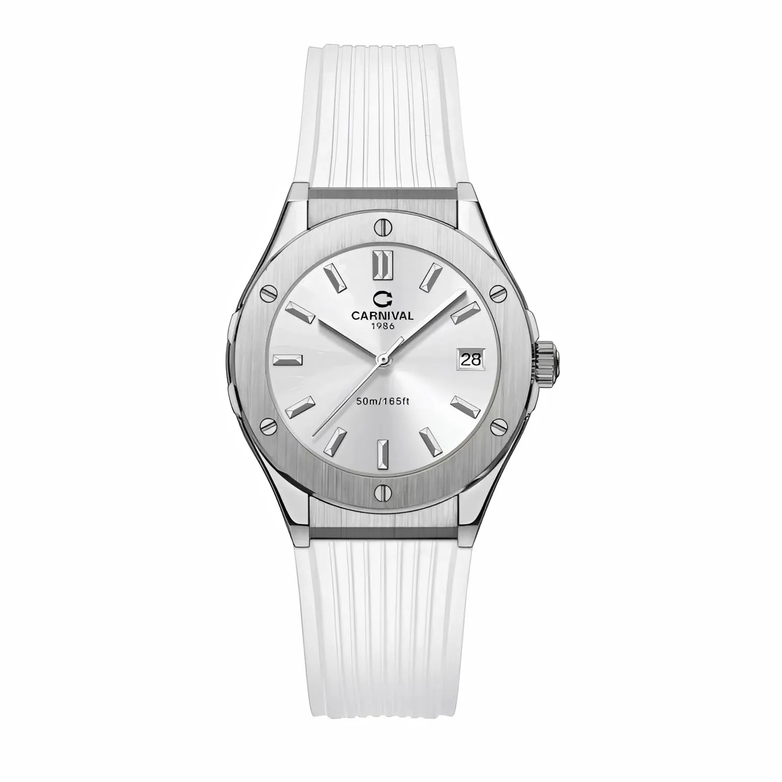 Điều khiến Đồng Hồ Carnival 34mm Nữ 8168L-VT-DCS-T1 trở nên đặc biệt chính là bộ dây cao su màu trắng đồng nhất với mặt số. Đây là một bước đi thông minh của hãng nhằm hướng tới đối tượng phụ nữ hiện đại: