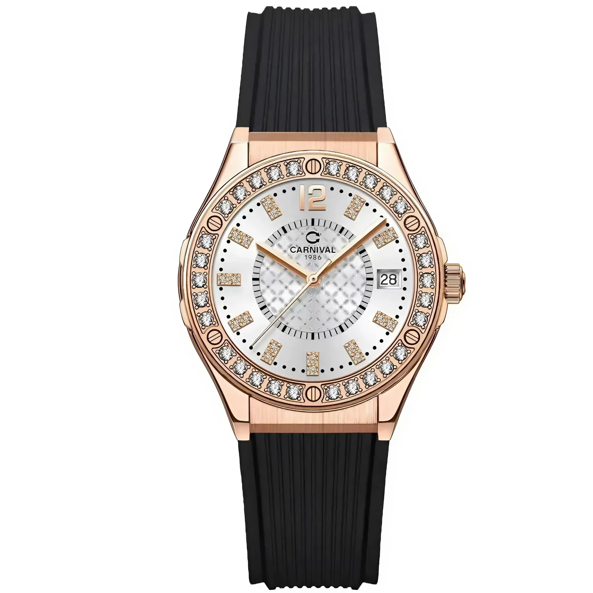 Khác với những mẫu đồng hồ nữ truyền thống thường dùng dây da hoặc dây thép, Đồng Hồ Carnival 34mm Nữ 8173L2-VH-DCS-T lại sử dụng dây cao su đen cao cấp với các đường gân sọc dọc mạnh mẽ. Sự kết hợp này mang lại nhiều ưu điểm vượt trội: