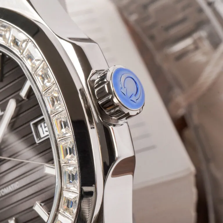 Toàn bộ vòng bezel được nạm đá quý nhân tạo với kỹ thuật cắt tinh xảo, tạo nên hiệu ứng tán sắc lộng lẫy dưới ánh sáng. Sự lấp lánh này không hề phô trương mà trái lại, nó tôn vinh vẻ lịch lãm của người sở hữu, biến chiếc đồng hồ trở thành tâm điểm của mọi ánh nhìn trong những buổi tiệc hay cuộc họp quan trọng.