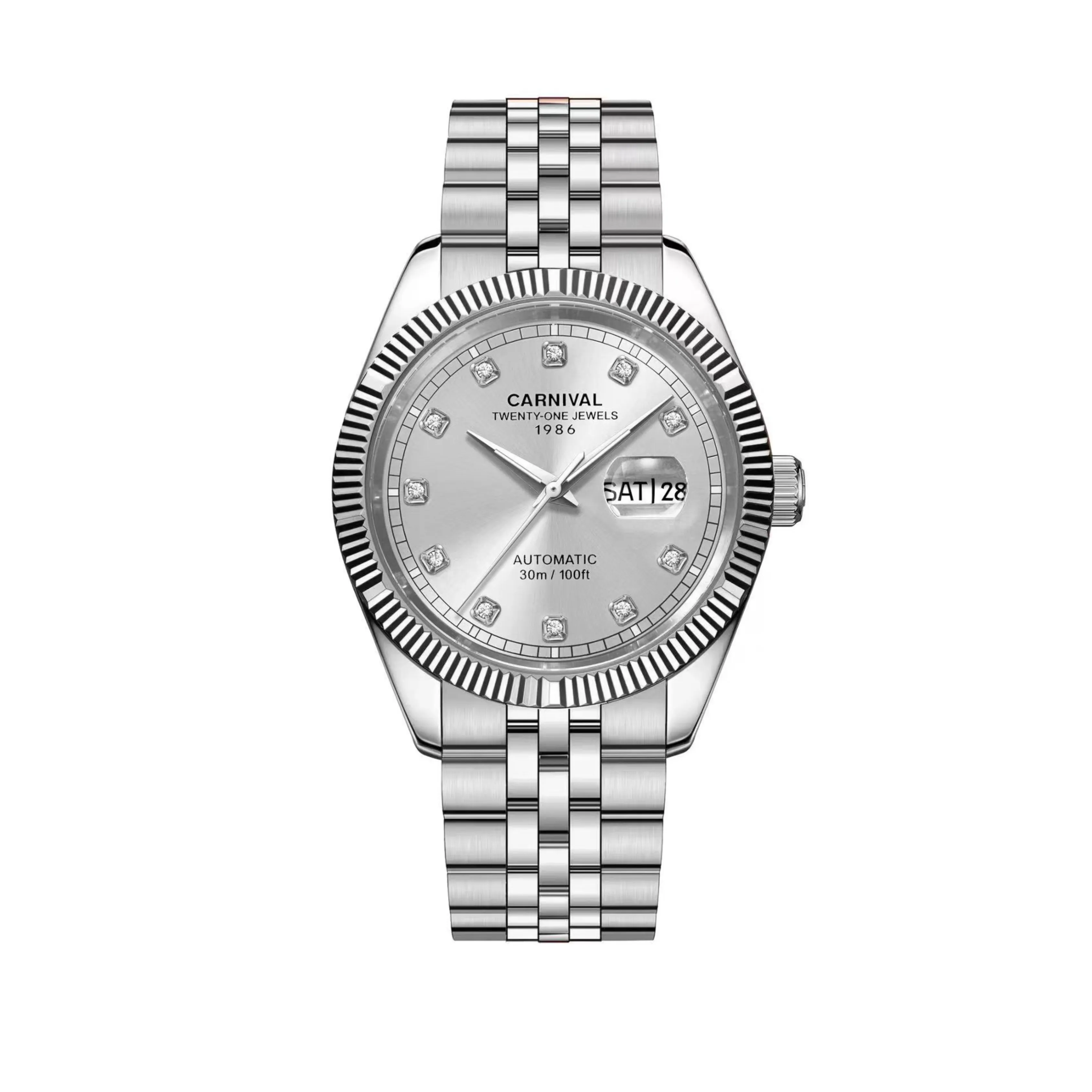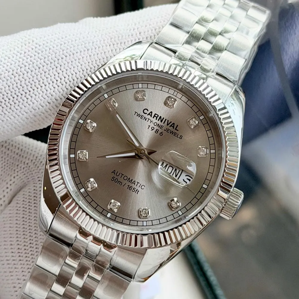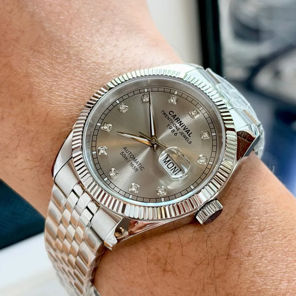 Một trong những chi tiết đắt giá nhất trên Đồng Hồ Carnival Nam 8131G-VT-XAM chính là vành bezel dạng vành băm (Fluted Bezel). Đây là kiểu thiết kế kinh điển thường xuất hiện trên các dòng đồng hồ xa xỉ bậc nhất thế giới. Những đường khía sắc sảo không chỉ tăng khả năng bắt sáng mà còn tạo nên diện mạo cứng cáp, nam tính cho người đeo.
