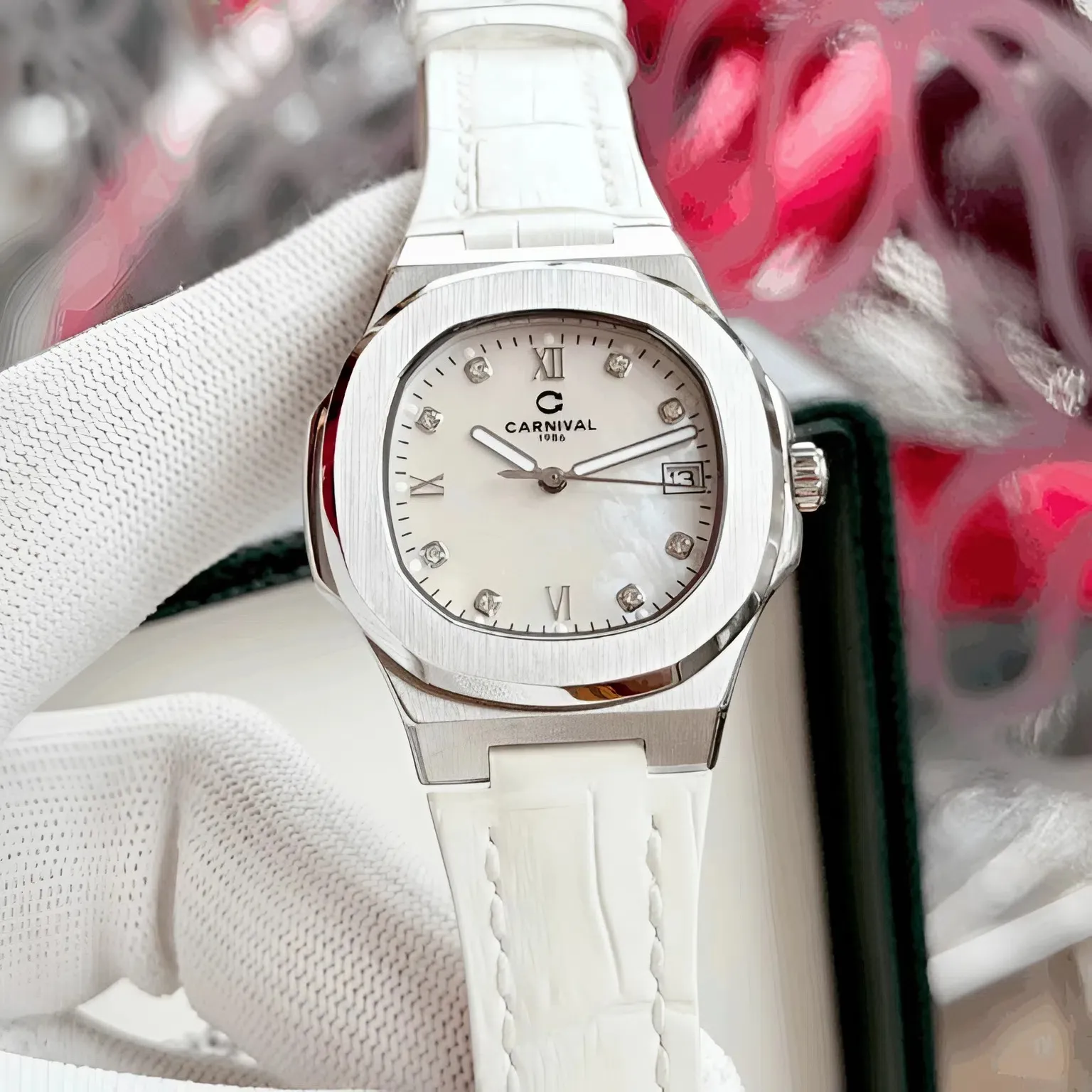 Điểm quyến rũ nhất của chiếc Đồng Hồ Carnival Nữ 8160L-VT-DD-TK nằm ở mặt số (dial) được khảm xà cừ thiên nhiên (Mother of Pearl). Dưới những góc độ ánh sáng khác nhau, mặt số sẽ tỏa ra ánh ngũ sắc huyền ảo, tạo nên vẻ đẹp độc bản không chiếc nào giống chiếc nào.