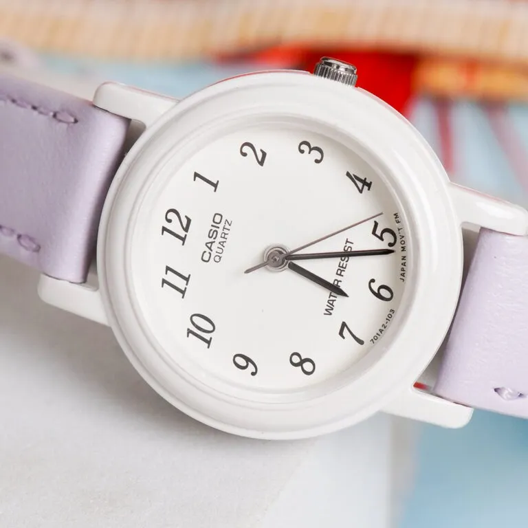Điểm độc bản khiến đồng hồ nữ Đồng Hồ Casio 25.2mm Nữ LQ-139L-6BDF tách biệt hoàn toàn khỏi các mẫu đồng hồ phổ thông chính là sắc tím Lavender (tím nhạt). Không rực rỡ như sắc đỏ, không lạnh lùng như sắc xanh, màu tím của mẫu Casio này mang lại cảm giác bình yên và cực kỳ tôn da. Khi kết hợp cùng phần vỏ nhựa trắng cao cấp, tổng thể chiếc đồng hồ hiện lên như một món trang sức thủ công tinh tế.