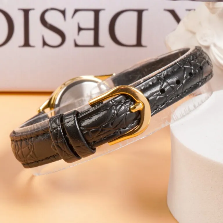 Phong cách quý cô công sở: Một bộ suit hoặc váy bút chì tối màu sẽ trở nên đẳng cấp hơn khi đi cùng chiếc đồng hồ vỏ vàng dây đen này.