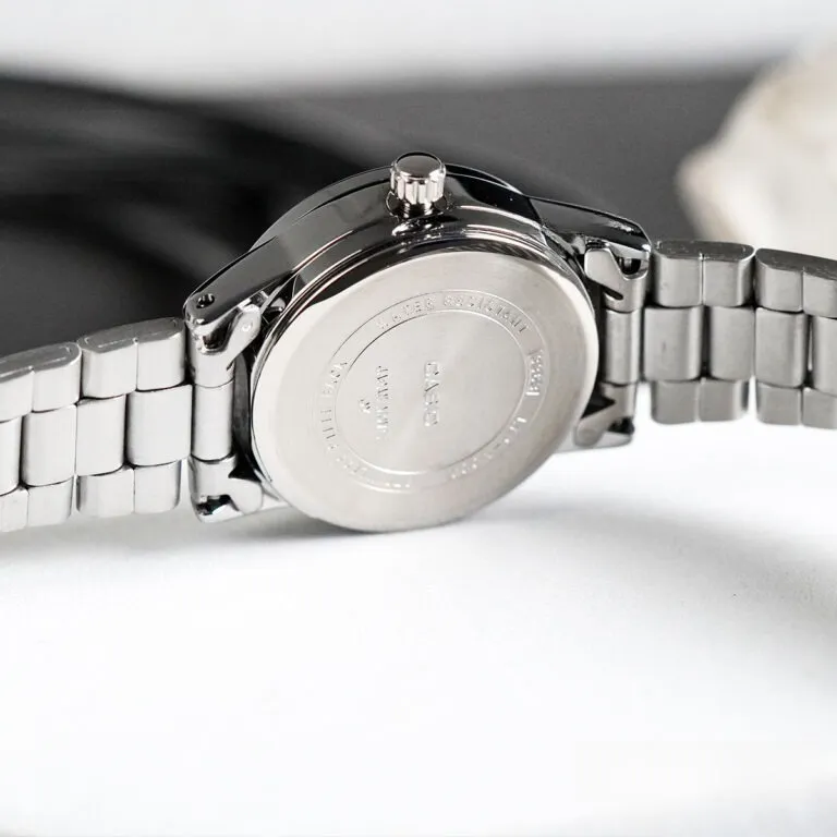 Điểm nhấn La Mã: Tại vị trí 6 giờ và 12 giờ, Casio đã khéo léo sử dụng ký tự La Mã, gợi nhớ đến phong cách thời trang cổ điển của những thập niên trước, tạo nên nét hoài cổ đầy lãng mạn.