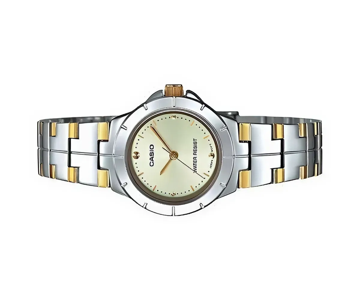 Điểm khiến Đồng Hồ Nữ Casio LTP-1242SG-9CDF trở nên khác biệt và thu hút ngay từ cái nhìn đầu tiên chính là phong cách thiết kế Demi (phối hai tông màu). Sự kết hợp giữa sắc bạc tinh khôi của thép không gỉ và những mắt xích mạ vàng sang trọng tạo nên một hiệu ứng thị giác cực kỳ bắt mắt.