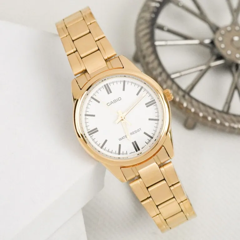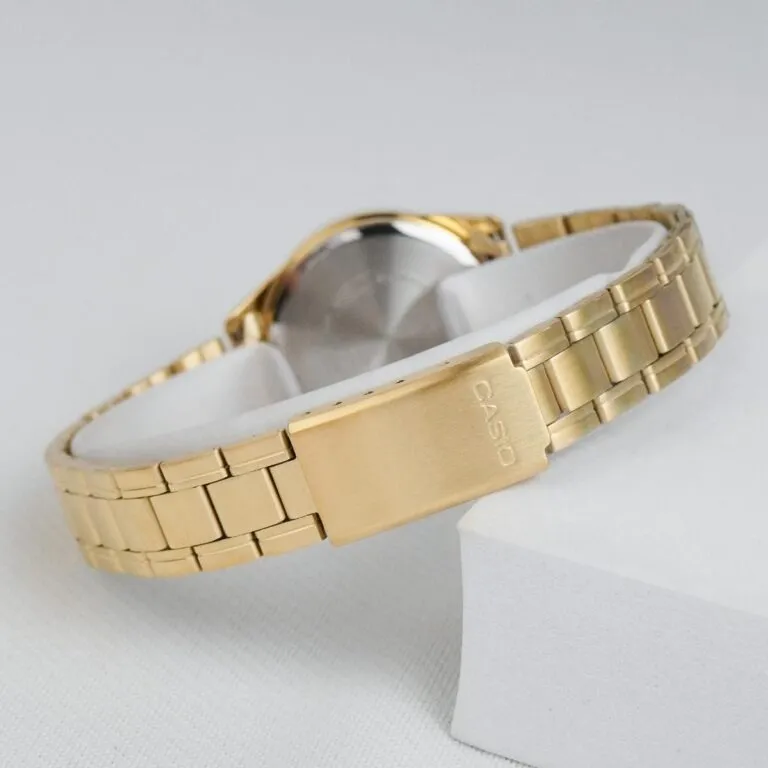 Điểm làm nên giá trị của Đồng Hồ Casio 28.2mm Nữ LTP-V005G-7AUDF chính là lớp mạ vàng toàn thân. Casio đã sử dụng công nghệ mạ Ion tiên tiến, giúp màu vàng bám chắc vào bề mặt thép không gỉ, tăng cường khả năng chống phai màu và trầy xước. Sắc vàng của đồng hồ mang tông màu Champagne sang trọng, không quá chói gắt, giúp bạn dễ dàng phối hợp với các loại trang sức vàng khác như nhẫn hay vòng tay mà vẫn giữ được sự tinh tế.