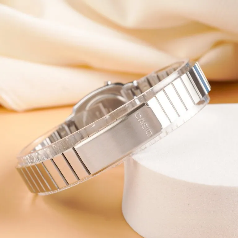 Dây đeo thép không gỉ: Casio đã sử dụng chất liệu hợp kim cao cấp cho phần dây đeo, giúp chống lại sự oxy hóa và tác động của môi trường. Dây đeo dạng mắt xích nhỏ không chỉ tạo độ mềm mại khi đeo mà còn tăng vẻ nữ tính.
