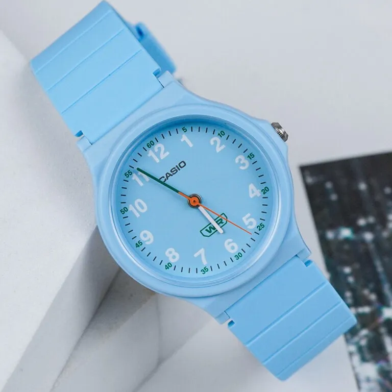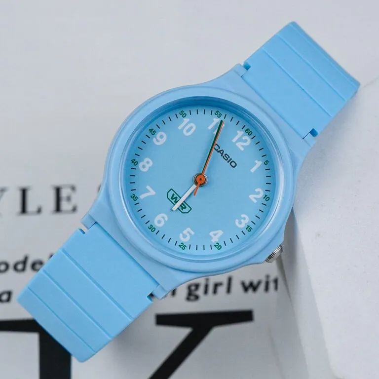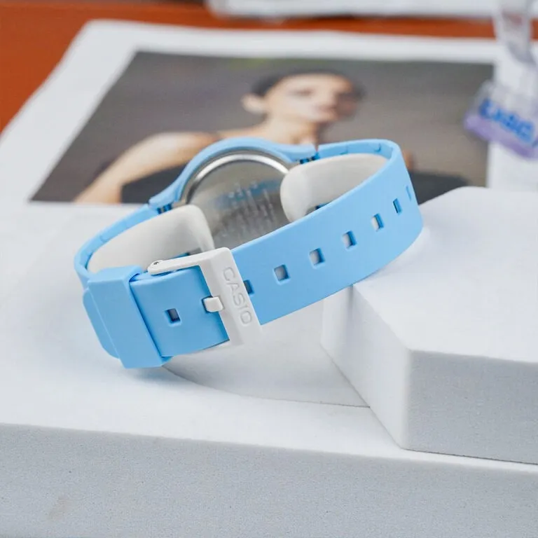 Ngay từ cái nhìn đầu tiên, chiếc đồng hồ Casio 31.5mm Unisex LQ-24B-2BDF đã gây ấn tượng mạnh bởi tông màu xanh da trời (Sky Blue) đồng nhất từ mặt số đến dây đeo. Đây là một gam màu Pastel cực kỳ "nịnh" mắt, không chỉ tạo cảm giác mát mẻ trong những ngày hè oi ả mà còn giúp người đeo trông trẻ trung, năng động hơn. Sắc xanh này cũng rất dễ phối đồ, từ những bộ đồng phục học sinh đến những bộ đồ dạo phố năng động.