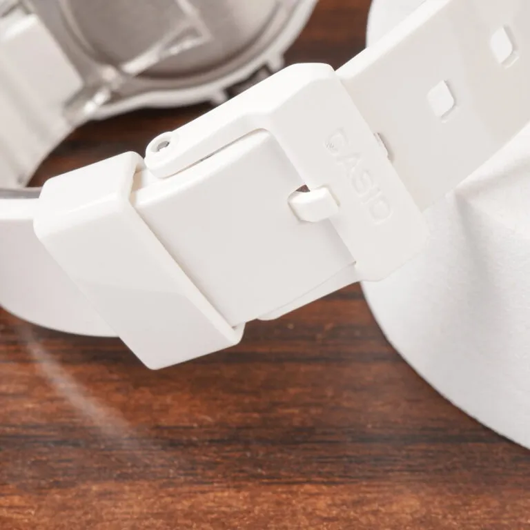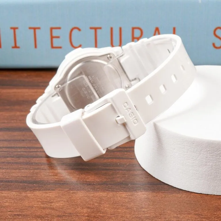 Sự kết hợp hoàn hảo: Sắc trắng tinh khôi của dây đeo nhựa kết hợp cùng mặt số màu xanh mint (bạc hà) tạo nên một tổng thể hài hòa, mát mẻ.