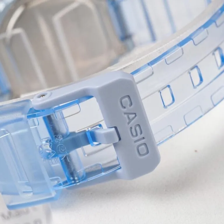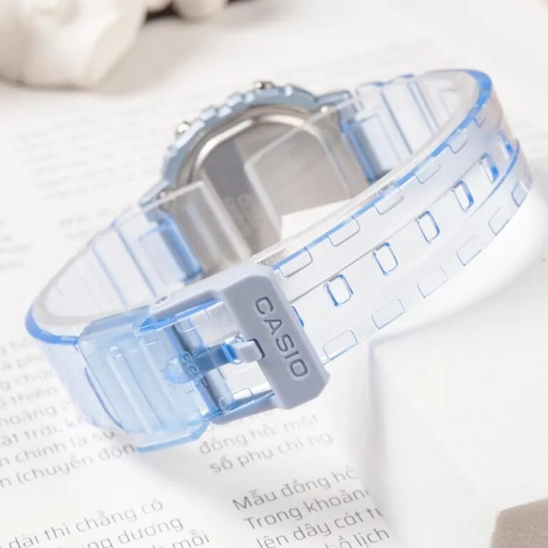 Điểm nhấn thu hút nhất của chiếc Đồng Hồ Casio 34.5 x 30.4 mm Unisex LA-20WHS-2ADF chính là bộ vỏ và dây đeo nhựa màu xanh dương trong suốt. Sắc xanh này gợi liên tưởng đến mặt nước biển trong vắt, mang lại cảm giác nhẹ nhàng nhưng vô cùng nổi bật.