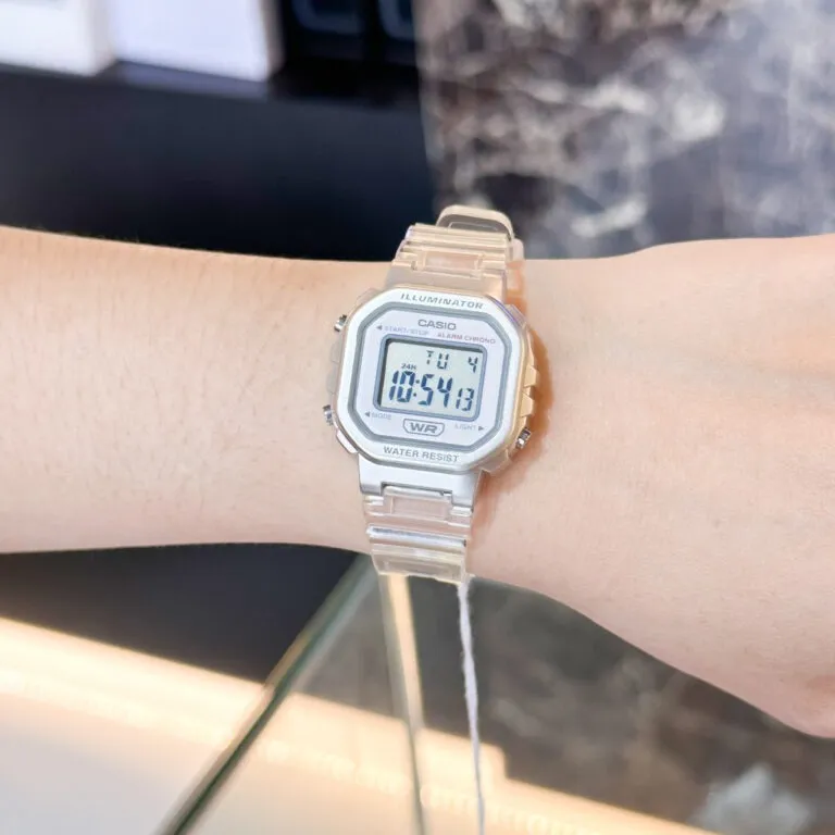 Điểm nhấn đầu tiên và mạnh mẽ nhất chính là bộ dây nhựa trong suốt. Xu hướng "Transparent" đã quay trở lại mạnh mẽ trong những năm gần đây, từ công nghệ đến thời trang. Với Đồng Hồ Casio 34.5 x 30.4 mm Unisex LA-20WHS-7ADF, chất liệu nhựa cao cấp không chỉ mang lại cảm giác nhẹ nhàng mà còn tạo hiệu ứng thị giác cực kỳ thú vị, giúp chiếc đồng hồ dễ dàng hòa hợp với bất kỳ tone màu trang phục nào.