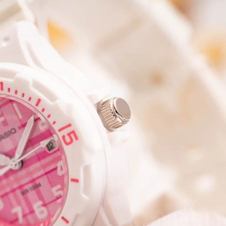 Phối màu nổi bật: Toàn bộ thân đồng hồ phủ một sắc trắng tinh khôi, làm nền hoàn hảo cho mặt số màu hồng rực rỡ. Đây là tông màu cực kỳ tôn da và dễ dàng tạo điểm nhấn cho bộ trang phục hàng ngày.