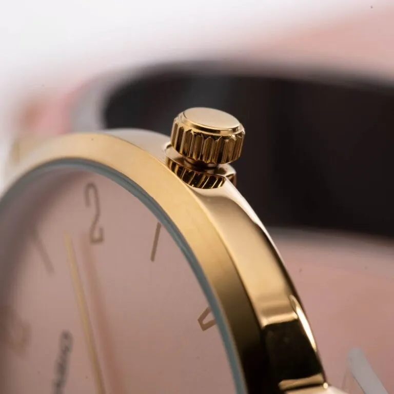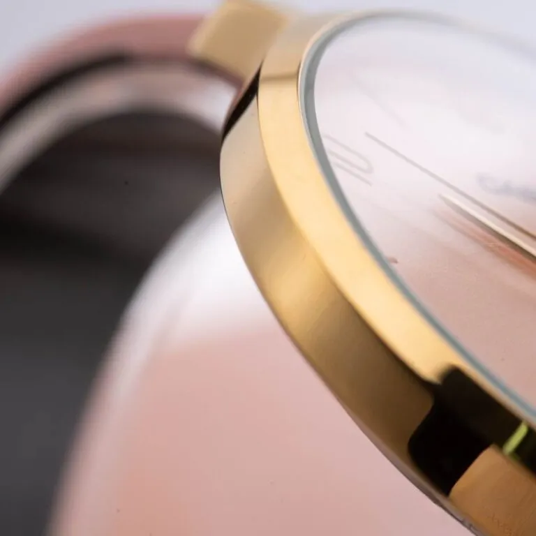 Kim chỉ giờ sang trọng: Bộ kim mạ vàng đồng nhất với vỏ và cọc số, chuyển động nhịp nhàng trên nền hồng, tạo nên một tổng thể hài hòa và cực kỳ nịnh mắt.