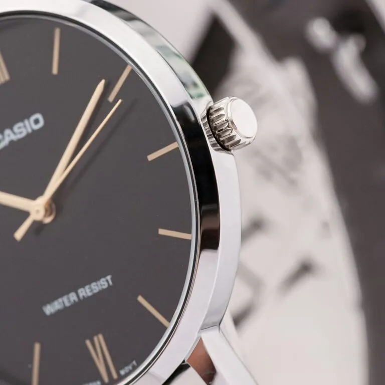 Điểm chạm đầu tiên khiến bất kỳ ai cũng phải ngẩn ngơ trước Đồng Hồ Casio 34mm Nữ LTP-VT01L-1BUDF chính là mặt số đen tuyền huyền bí. Casio đã lược bỏ tối đa các chi tiết rườm rà, chỉ giữ lại những vạch số thanh mảnh và bộ kim tinh xảo màu vàng hồng gold.
