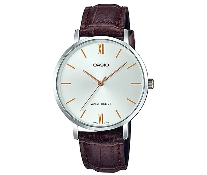 Dây đeo là bộ phận quan trọng quyết định đến cảm giác thoải mái khi sử dụng. Đồng Hồ Casio 34mm Nữ LTP-VT01L-7B2UDF sử dụng dây da màu nâu sẫm, được dập vân cá sấu tỉ mỉ, mang lại vẻ ngoài cổ điển và chuyên nghiệp.