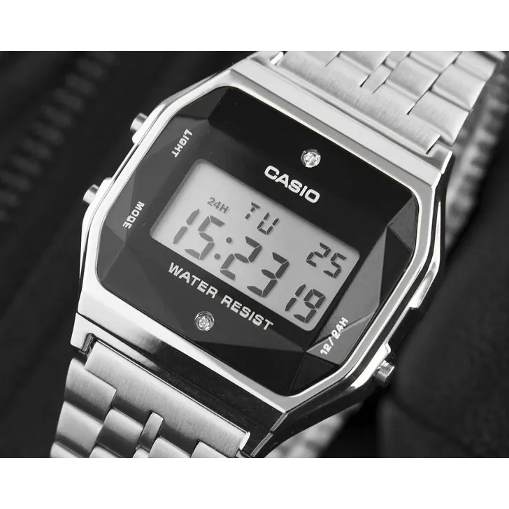 Điểm nhấn đắt giá nhất, biến Đồng Hồ Casio 36.8 × 33.2 mm Unisex A159WAD-1DF trở thành tâm điểm của dòng Vintage chính là sự xuất hiện của kim cương tự nhiên. Tại vị trí 12 giờ và 6 giờ, hai viên kim cương thật được đính thủ công, mang đến vẻ đẹp vĩnh cửu và chiều sâu cho mặt số đen huyền bí.