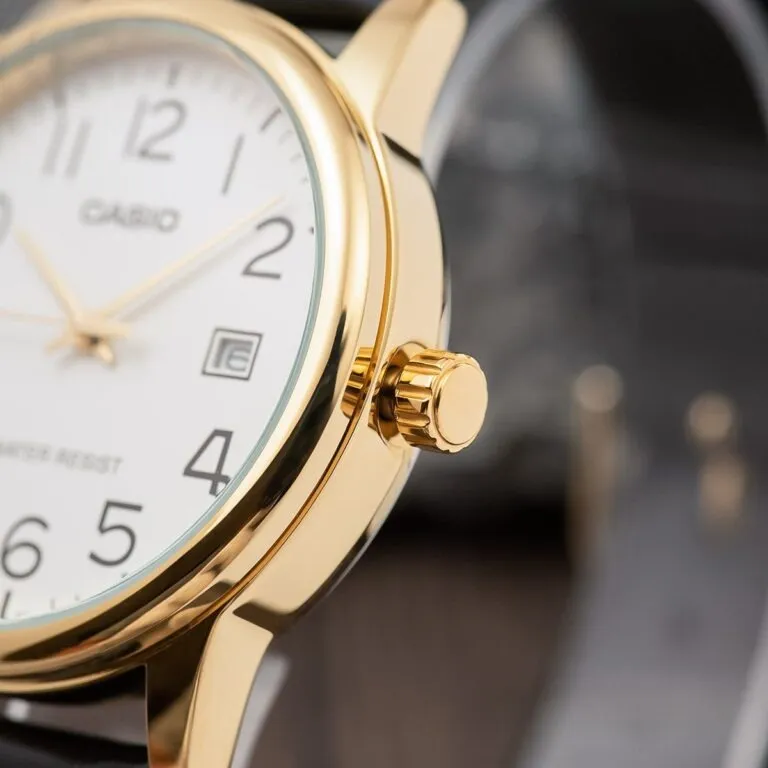 Điểm nhấn đầu tiên khiến tôi muốn giới thiệu Đồng Hồ Casio 37mm Nam MTP-V002GL-7B2UDF tới bạn chính là sự kết hợp màu sắc cực kỳ quyền lực. Vỏ đồng hồ được mạ vàng gold sang trọng, sáng bóng, bao bọc lấy mặt số trắng tinh khôi.