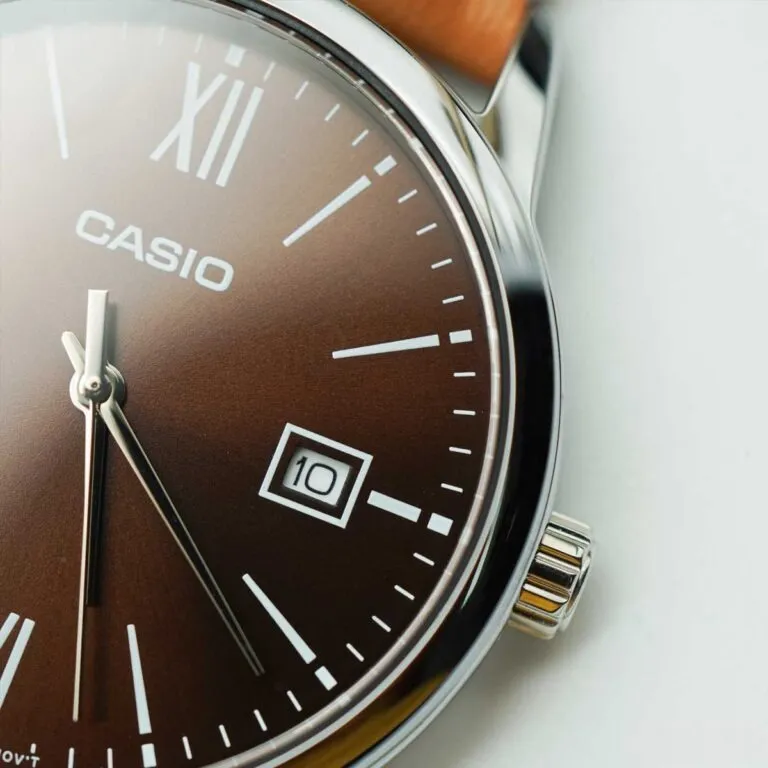 Mặt số nâu Cafe dập vân: Không phải là màu nâu phẳng lì, Casio đã khéo léo xử lý bề mặt với các đường vân chải tia Sunray. Khi bạn nghiêng đồng hồ theo các góc ánh sáng khác nhau, mặt số sẽ chuyển đổi từ nâu sẫm sang nâu mật ong rạng rỡ.