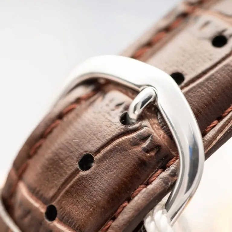 Dây da nâu vân cá sấu: Bộ dây đeo bằng da thật màu nâu sẫm, được dập vân cá sấu tỉ mỉ, mang lại cảm giác sang trọng và cổ điển. Chất liệu da mềm mại, ôm sát cổ tay, tạo sự thoải mái tối đa dù bạn đeo suốt cả ngày dài.