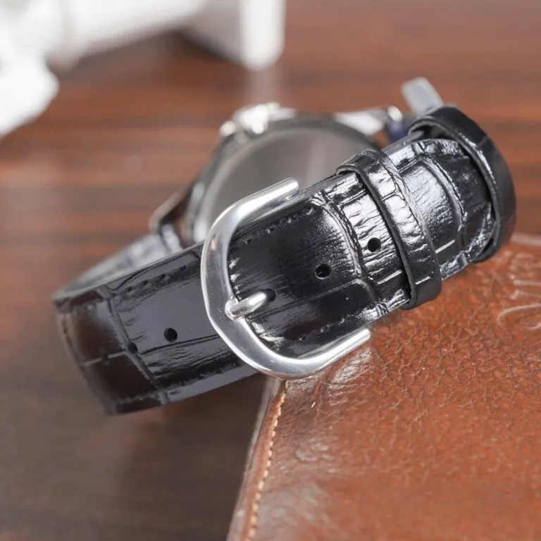 Dây da vân cá sấu: Bộ dây da đen được dập vân tinh tế, mang lại cảm giác sang trọng thường chỉ thấy trên các dòng đồng hồ cao cấp. Chất liệu da mềm mại giúp ôm sát cổ tay, tạo sự thoải mái tối đa kể cả khi bạn phải đeo suốt 8 tiếng làm việc.