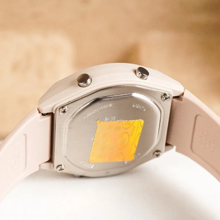 Đặc biệt, phần viền mặt số được xử lý với hiệu ứng chuyển màu sắc sảo, tạo cảm giác lung linh như những dải cực quang. Sự kết hợp giữa vỏ hồng và mặt số điện tử hiện đại giúp chiếc đồng hồ này thoát khỏi vẻ ngoài thô cứng thường thấy của dòng đồng hồ nhựa, thay vào đó là một diện mạo vô cùng "trendy" và nữ tính.