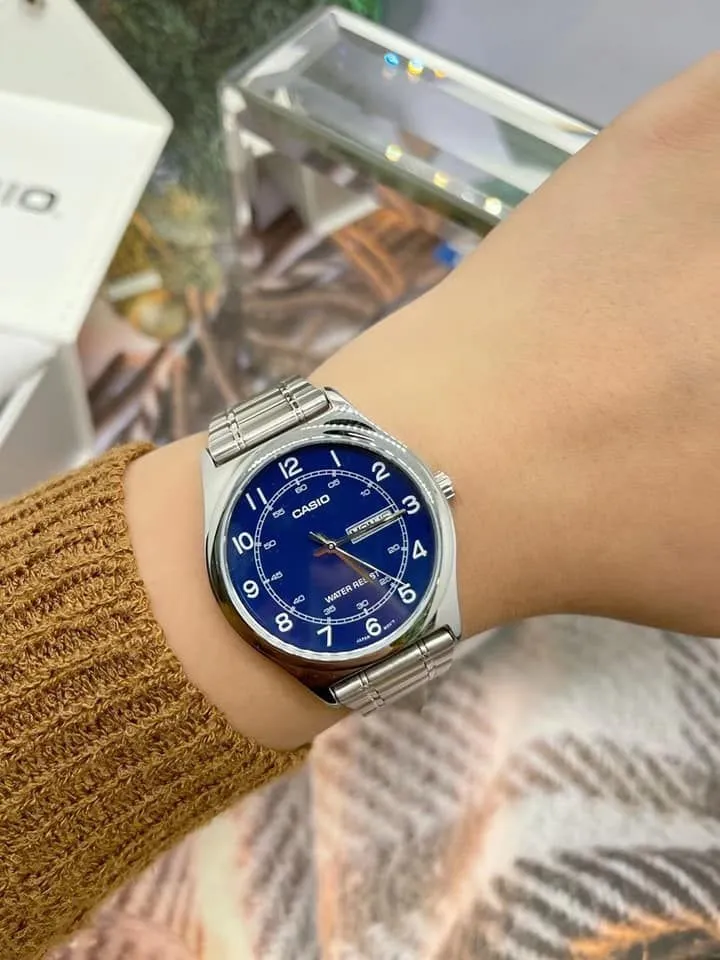 Điểm nhấn đầu tiên và cũng là đắt giá nhất trên chiếc Đồng Hồ Casio 38mm Nam MTP-V006D-2BUDF chính là mặt số màu xanh dương đậm (Navy Blue). Sắc xanh này mang lại cảm giác trẻ trung, hiện đại nhưng không kém phần sâu lắng và nam tính.