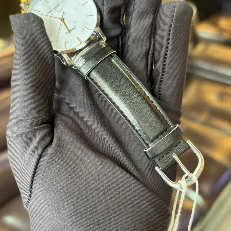 Kết hợp hoàn hảo với bộ vỏ bạc là dây đeo bằng da màu đen cao cấp. Chất liệu da mềm mại không chỉ mang lại cảm giác thoải mái khi sử dụng lâu dài mà còn tôn lên vẻ thanh lịch của bộ máy. Mặt kính khoáng (Mineral Crystal) với độ trong suốt cao không chỉ bảo vệ tốt mặt số vân đá bên trong mà còn có khả năng chịu lực ổn định trong các va chạm thường ngày.