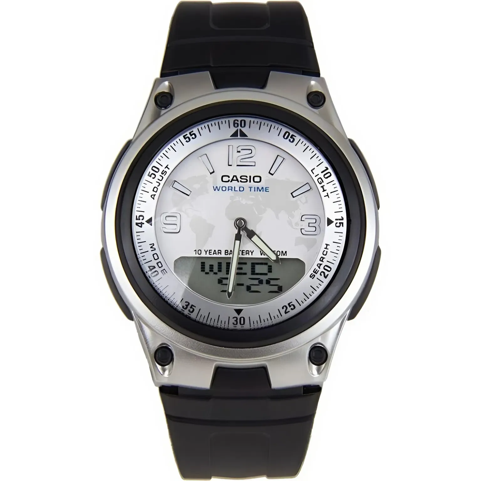Điều khiến tôi đánh giá cao nhất ở Đồng Hồ Casio 40mm Nam AW-80-7A2VDF chính là thiết kế Ana-Digi (Analog-Digital). Bạn sẽ có một mặt số trắng bạc tinh tế với bộ kim chỉ giờ truyền thống, mang lại vẻ ngoài lịch lãm. Ngay phía dưới là một màn hình LCD nhỏ gọn nhưng hiển thị đầy đủ các thông số điện tử như ngày tháng, giờ thế giới hay các chế độ báo thức.