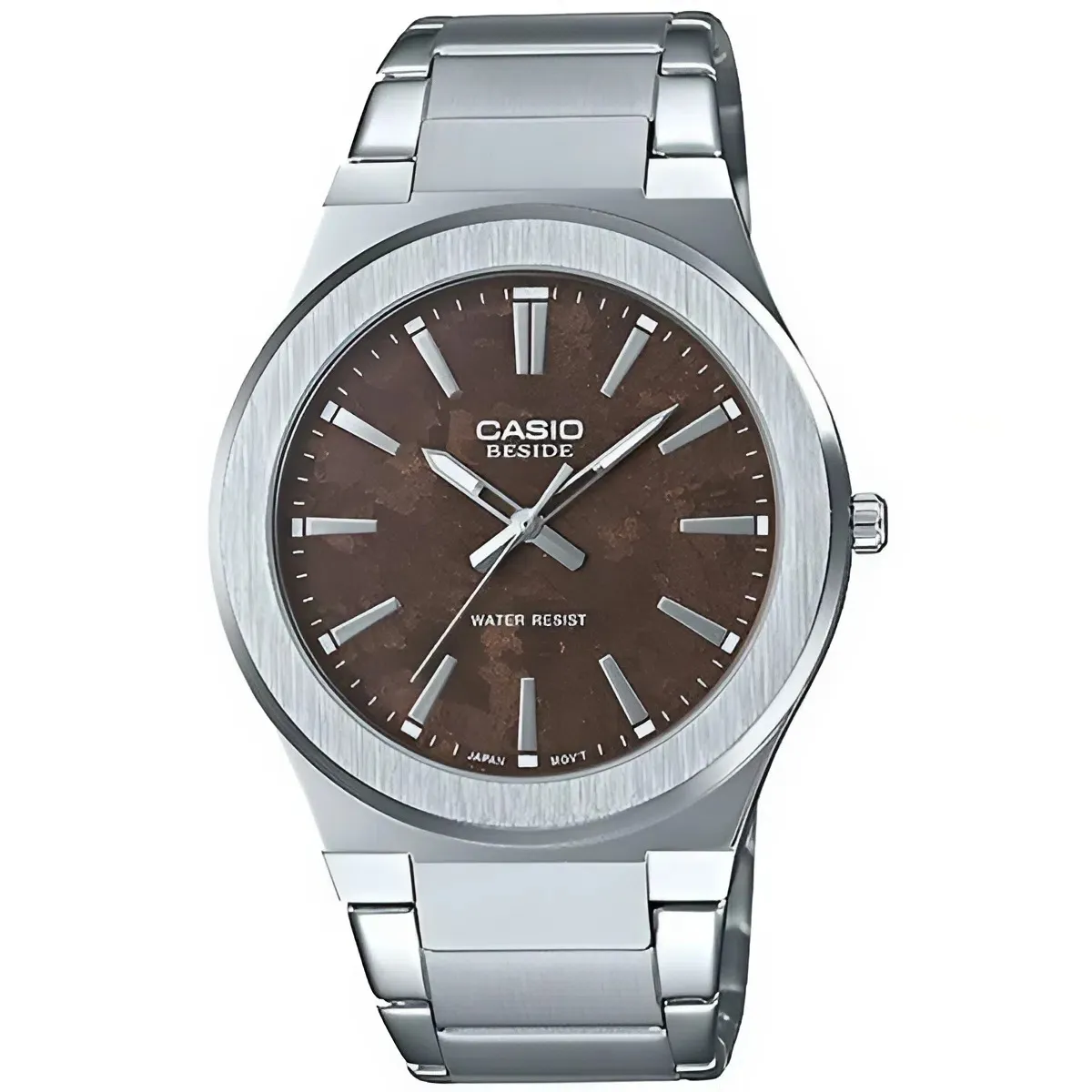 Điểm làm nên sức hút mãnh liệt nhất của Đồng Hồ Casio 40mm Nam BEM-SL100D-5ADF chính là phần mặt số (dial). Thay vì sử dụng những tông màu đơn sắc thường thấy, Casio đã khéo léo đưa vào họa tiết vân đá nâu với các mảng loang lổ nghệ thuật.