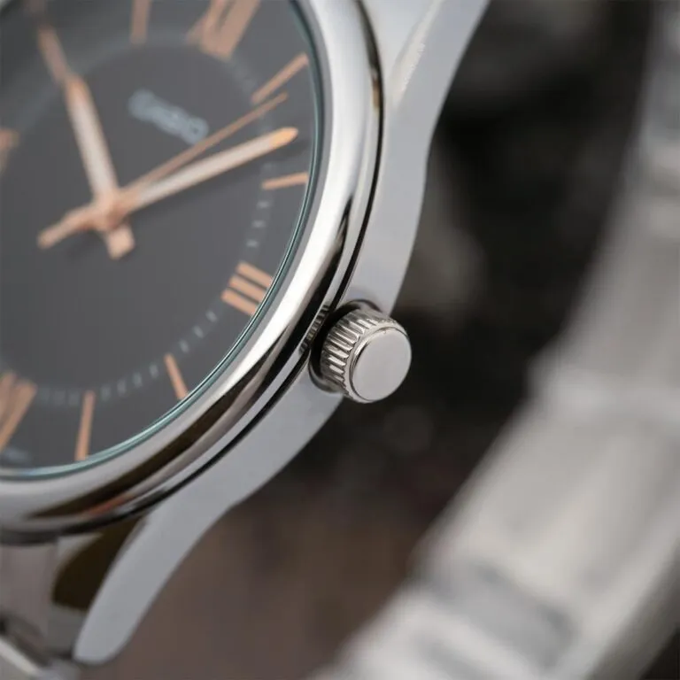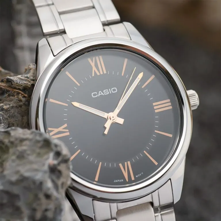 Điểm khiến Đồng Hồ Casio 40mm Nam MTP-V005D-1B5UDF trở nên đặc biệt so với các dòng MTP khác chính là bảng màu sắc xảo. Bộ vỏ và dây đeo thép không gỉ giữ nguyên màu bạc sáng bóng, tạo nên bộ khung vững chãi và sạch sẽ. Trên nền mặt số đen tuyền, các cọc số La Mã cùng bộ kim được mạ màu Rose Gold (vàng hồng) tinh tế. Sự kết hợp này mang lại cảm giác ấm áp, sang trọng, xóa đi sự lạnh lẽo của kim loại và sự đơn điệu của mặt đen truyền thống.