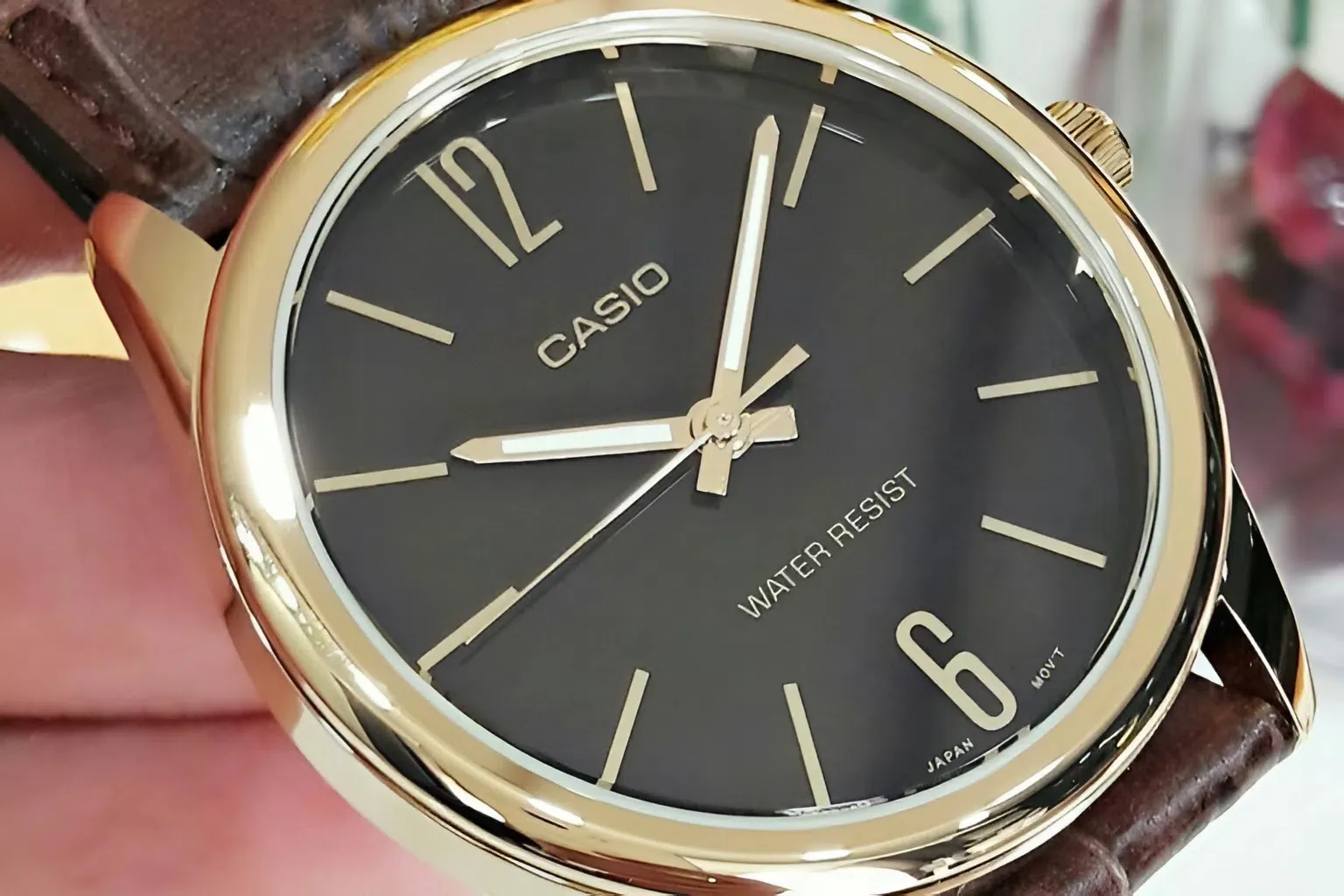 Lớp vỏ mạ vàng Gold quý phái: Phần viền bezel và vỏ máy được hoàn thiện bằng công nghệ mạ tiên tiến, mang lại sắc vàng rực rỡ, bóng bẩy. Màu vàng này khi phối cùng trang phục công sở sẽ tạo nên điểm nhấn cực kỳ thu hút.