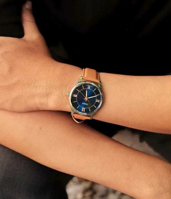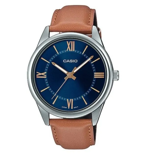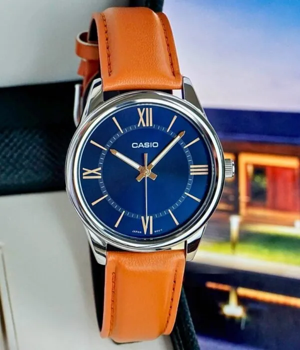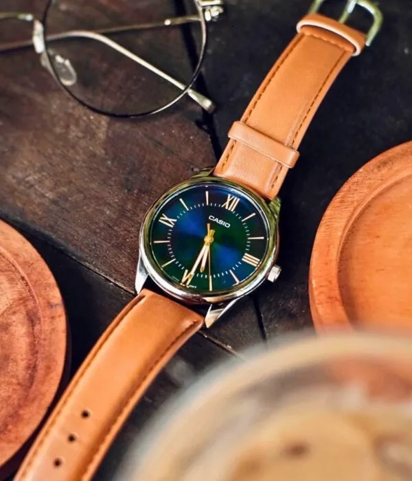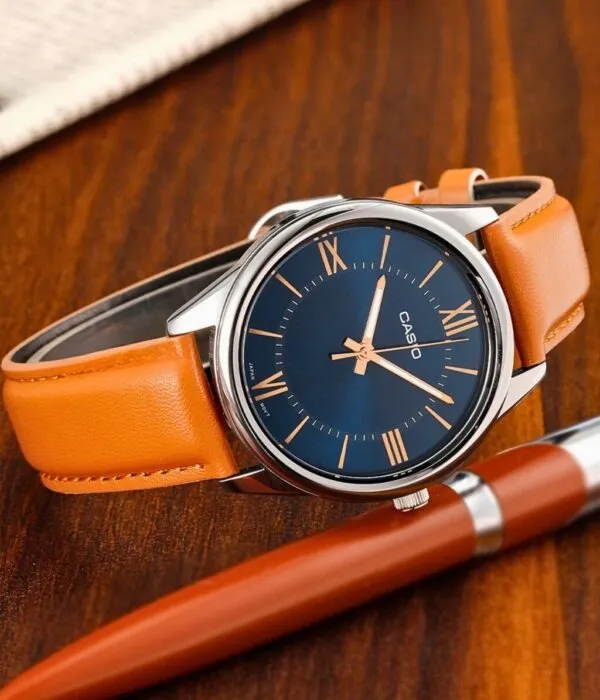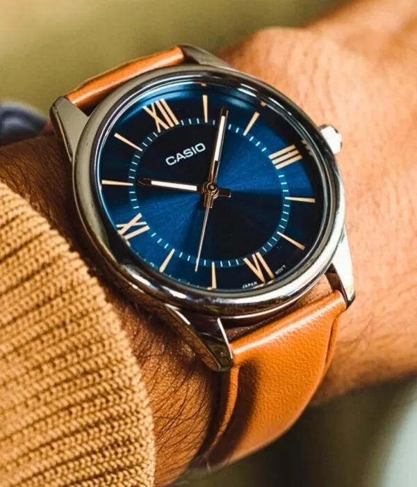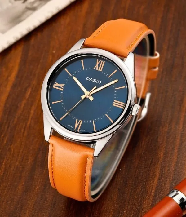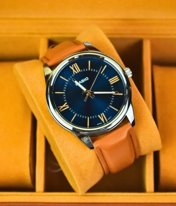 Điểm làm nên sự khác biệt lớn nhất của Đồng Hồ Casio 40mm Nam MTP-V005L-2B5UDF chính là sự kết hợp màu sắc vô cùng thú vị. Mặt số xanh Navy sâu thẳm mang lại vẻ huyền bí và quyền lực. Đối lập với đó là bộ dây da cao cấp màu cam đất (Tan) nổi bật.