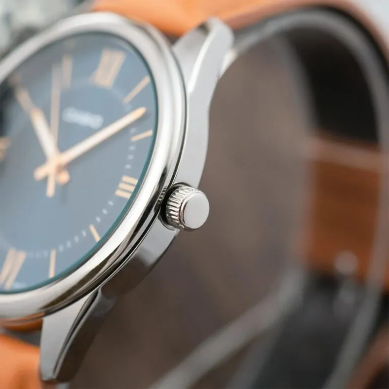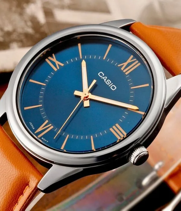 Trên nền mặt số xanh, các cọc số La Mã được in sắc nét cùng bộ kim chỉ giờ thanh mảnh màu vàng hồng. Thiết kế này của Đồng Hồ Casio 40mm Nam MTP-V005L-2B5UDF gợi nhớ đến những mẫu đồng hồ cao cấp từ châu Âu. Việc sử dụng số La Mã thay vì số học trò hay vạch kẻ đơn thuần đã nâng tầm giá trị thẩm mỹ của sản phẩm lên rất nhiều, biến nó thành một biểu tượng của sự tinh tế và học thức.
