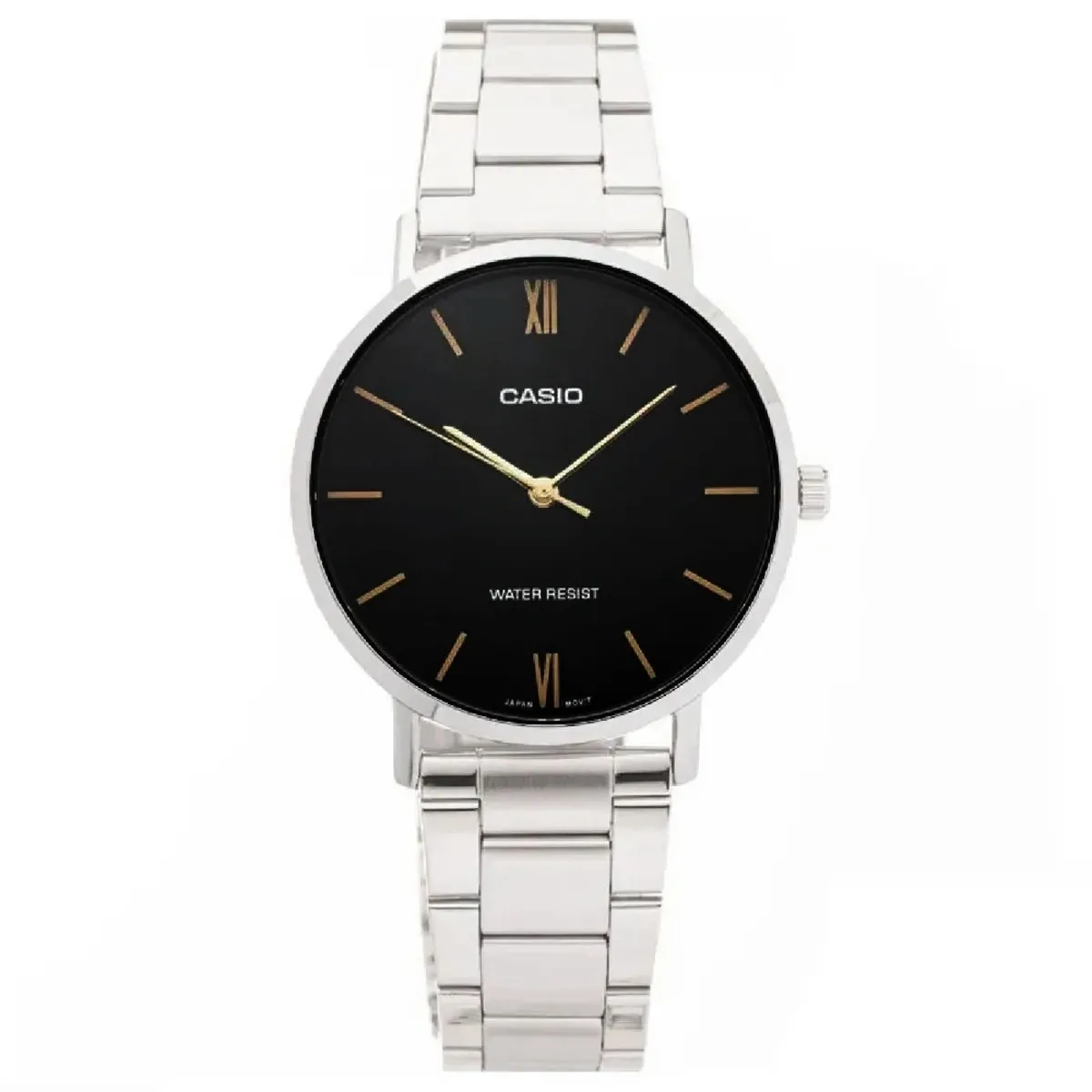 Điểm chạm đầu tiên khiến bất kỳ ai cũng phải xao xuyến khi nhìn vào Đồng Hồ Casio 40mm Nam MTP-VT01D-1BUDF chính là mặt số đen tuyền thanh lịch. Thay vì những cọc số dày đặc, Casio đã khéo léo sử dụng các vạch số thanh mảnh, điểm xuyết bằng chữ số La Mã tại vị trí 6 giờ và 12 giờ.