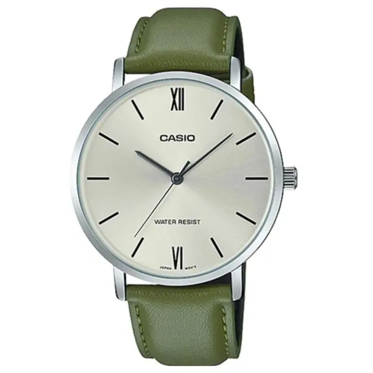 Nếu bạn đã quá quen thuộc với những mẫu dây da đen hay nâu truyền thống, thì Đồng Hồ Casio 40mm Nam MTP-VT01L-3BUDF sẽ mang đến một làn gió mới. Sự kết hợp giữa mặt số bạc sáng bóng và bộ dây da màu xanh rêu (Olive) là một bước đi đầy táo bạo nhưng cực kỳ thành công của Casio.