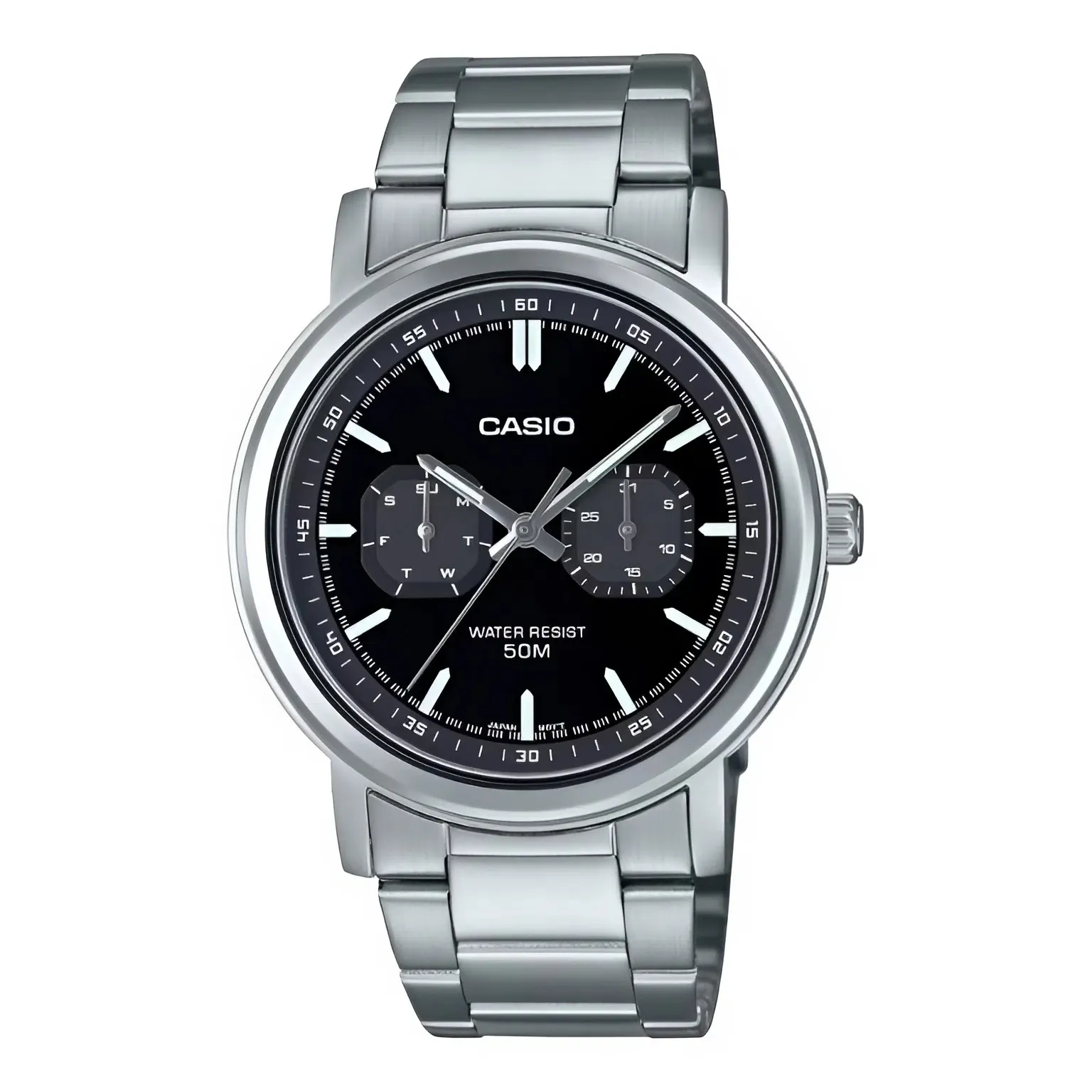 Điểm nhấn đắt giá nhất trên chiếc đồng hồ Casio 41.5mm nam MTP-E335D-1EVDF chính là cách sắp xếp mặt số. Thay vì mặt số đơn thuần, Casio đã khéo léo lồng ghép các mặt phụ (sub-dial) hiển thị thứ, ngày và định dạng 24 giờ. Cấu trúc 6 kim này mang lại một diện mạo mang hơi hướng của những dòng Chronograph cao cấp, tạo cảm giác mạnh mẽ và tràn đầy năng lượng.