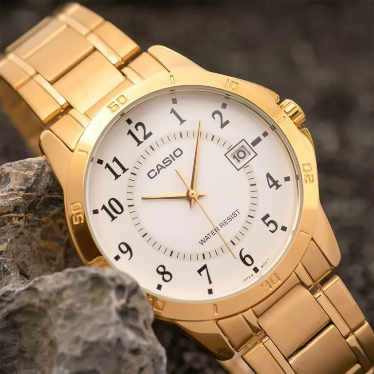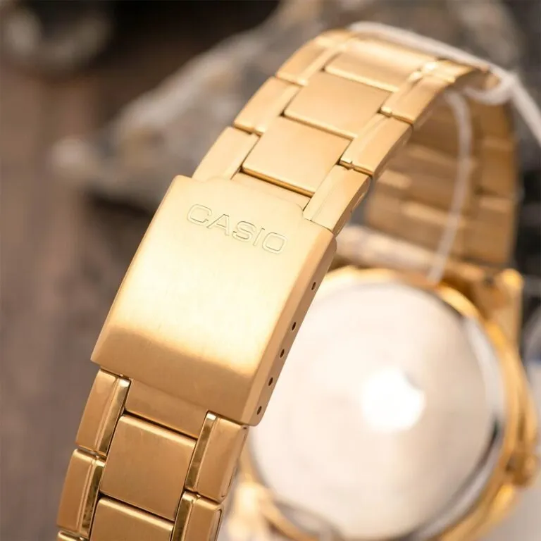 Điểm khiến đồng hồ Casio 41.5mm nam MTP-V004G-7BUDF trở nên khác biệt ngay từ cái nhìn đầu tiên chính là lớp mạ vàng Gold Ion Plated phủ toàn bộ thân vỏ và dây đeo. Công nghệ mạ hiện đại của Casio giúp lớp màu có độ sâu, bóng bẩy và khả năng bám màu cực tốt, tạo nên vẻ ngoài không hề kém cạnh những dòng đồng hồ Thụy Sỹ cao cấp.