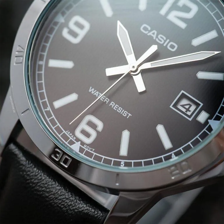 Khác với những mẫu dây kim loại có phần nặng nề, Đồng Hồ Casio 41.5mm Nam MTP-V004L-1BUDF sử dụng dây da đen cao cấp.