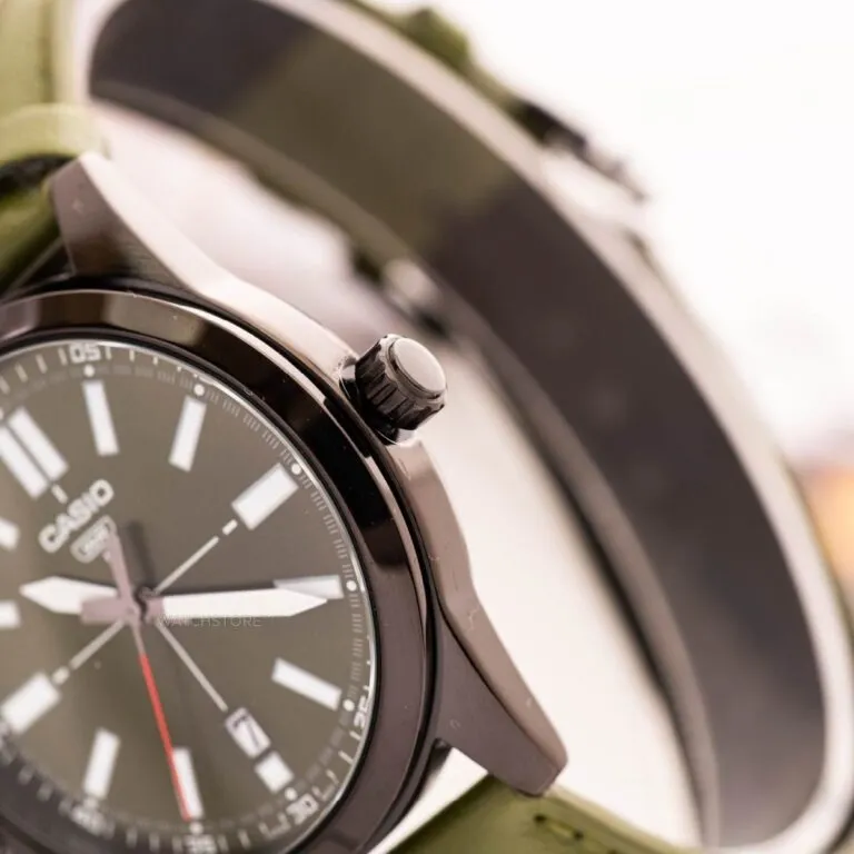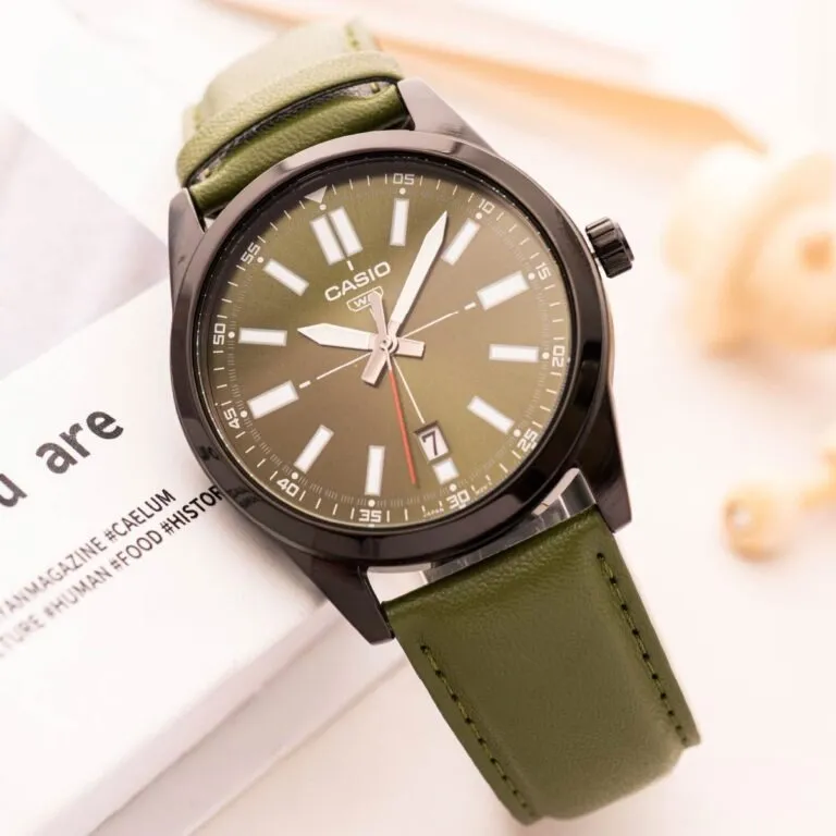 Nếu mặt số là linh hồn thì bộ dây chính là phong thái của chiếc đồng hồ. Đồng Hồ Casio 41mm Nam MTP-VD02BL-3EUDF sở hữu sợi dây đeo bằng da màu xanh rêu (Military Green) độc bản. Đây là tông màu tượng trưng cho thiên nhiên, cho sự bền bỉ và ý chí kiên cường của những người lính.