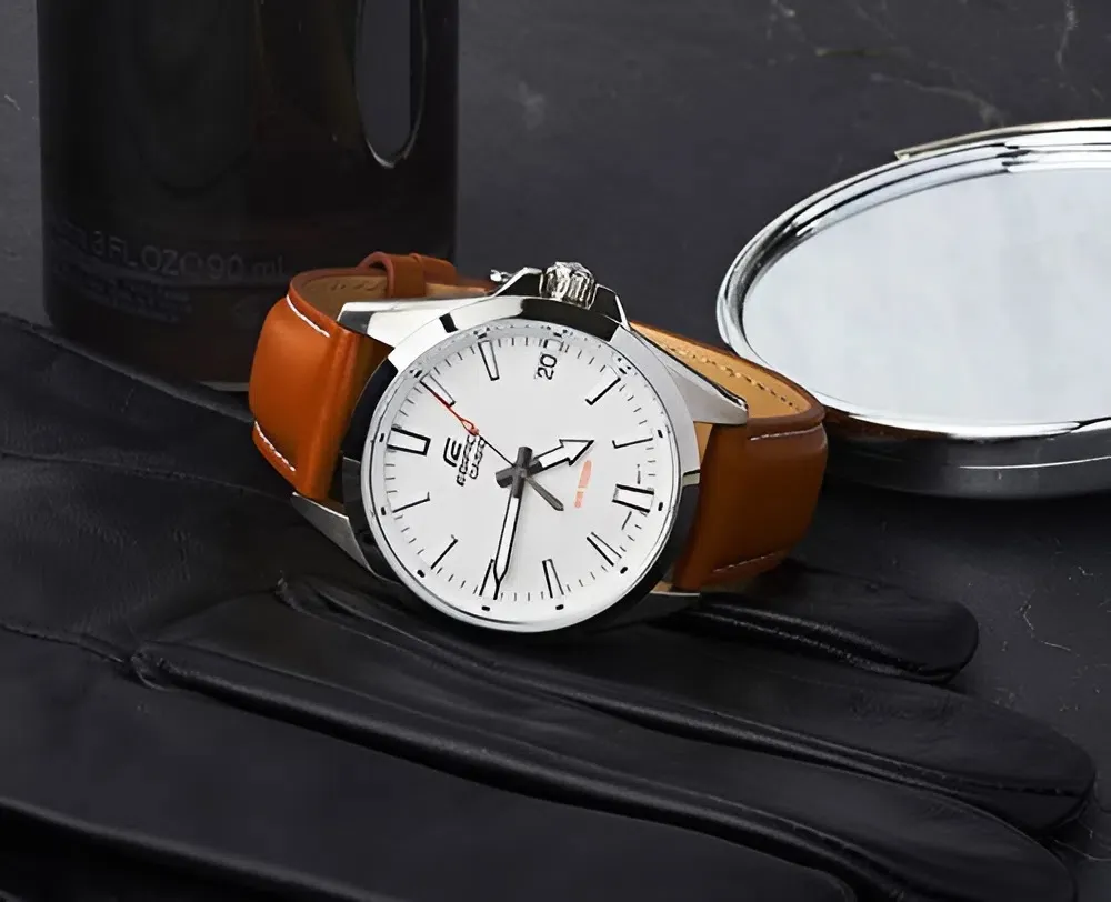 Điểm thu hút đầu tiên của Đồng Hồ Casio 42mm Nam EFV-100L-7AVUDF chính là sự kết hợp hoàn hảo giữa mặt số trắng tinh khôi và bộ dây da nâu mật ong.