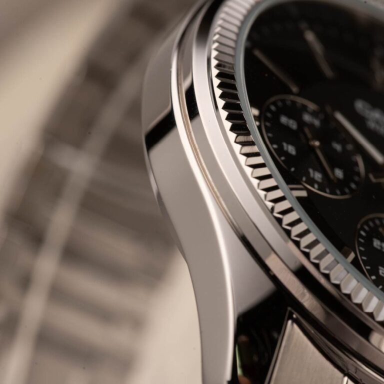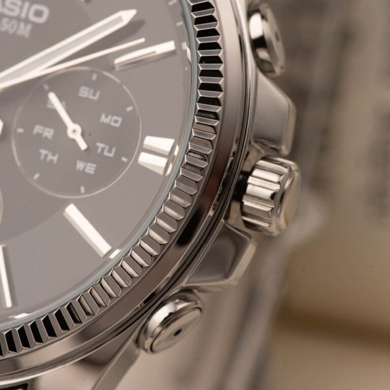 Điểm đầu tiên khiến bất cứ ai cũng phải ngoái nhìn Đồng Hồ Casio 42mm Nam MTP-1375D-1AVDF chính là phần niềng băm (fluted bezel) cực kỳ tinh xảo. Lấy cảm hứng từ những dòng đồng hồ Thụy Sĩ xa xỉ, chi tiết này giúp chiếc đồng hồ bắt sáng đa góc độ, tạo nên vẻ ngoài lung linh và đắt tiền hơn gấp nhiều lần so với giá trị thực tế.