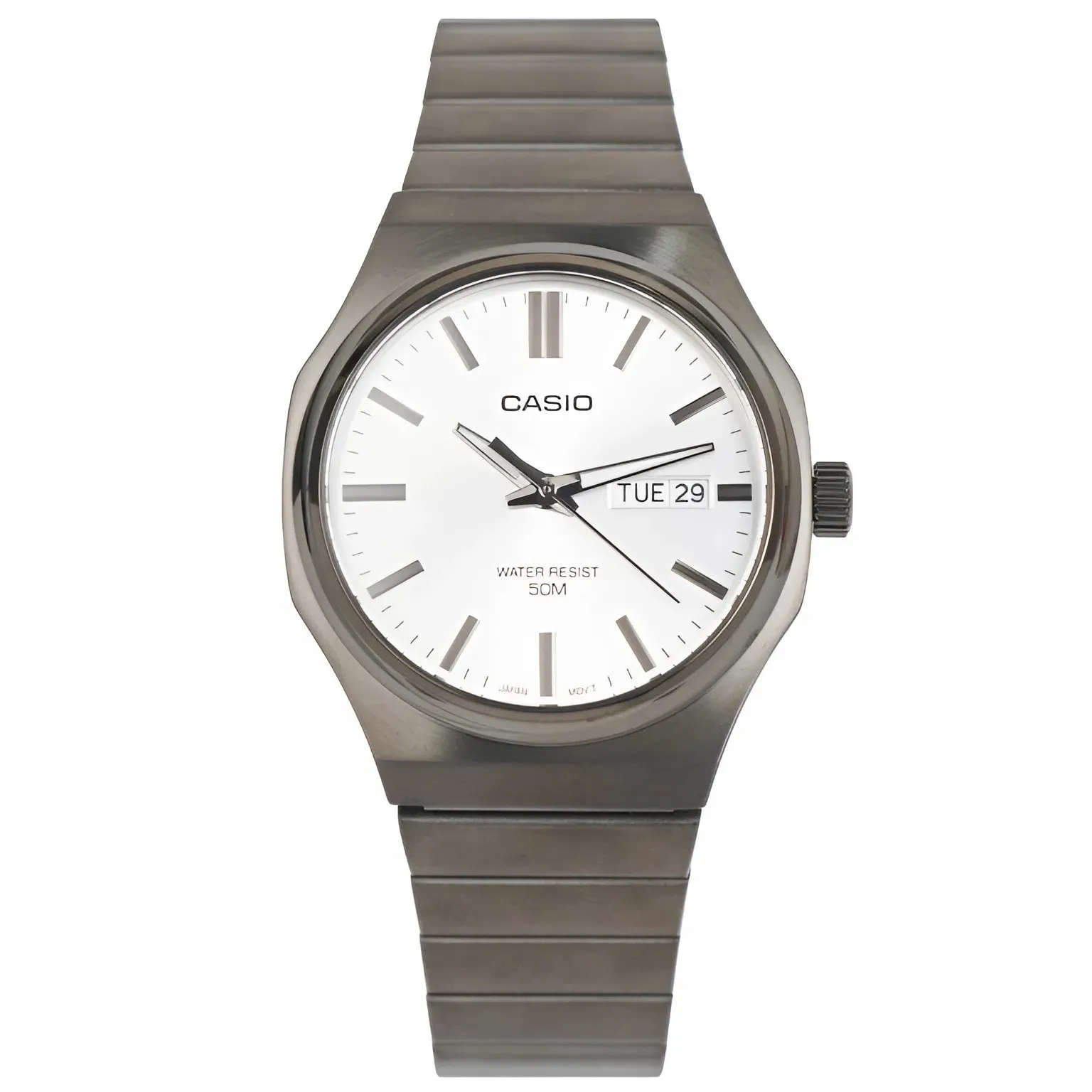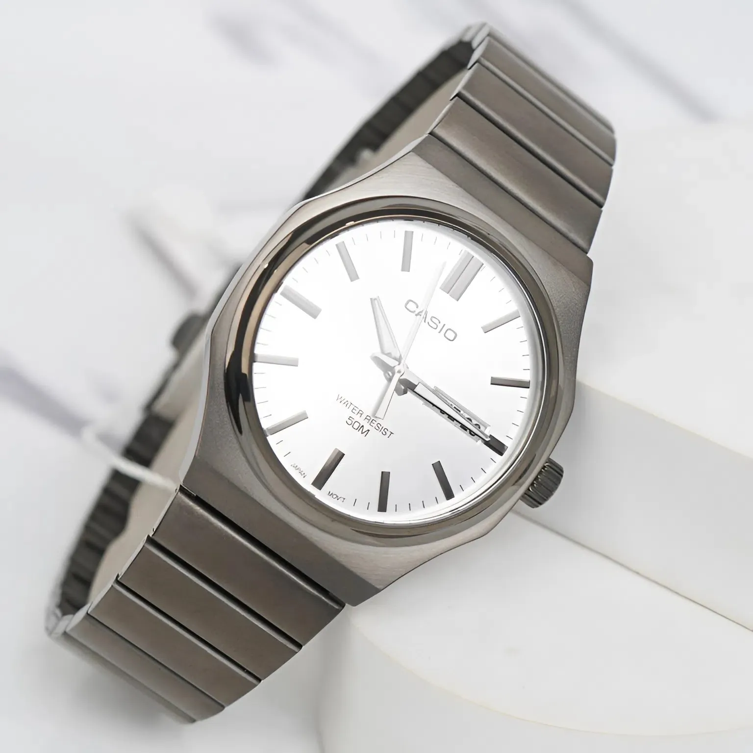 Điều đầu tiên đập vào mắt chúng ta chính là cấu trúc mặt số bát giác (Octagonal). Đây không phải là một thiết kế xa lạ trong giới đồng hồ cao cấp, nhưng cách Casio đưa nó vào dòng MTP lại mang đến một cảm giác rất riêng: trẻ trung và không hề bị "dừ".
