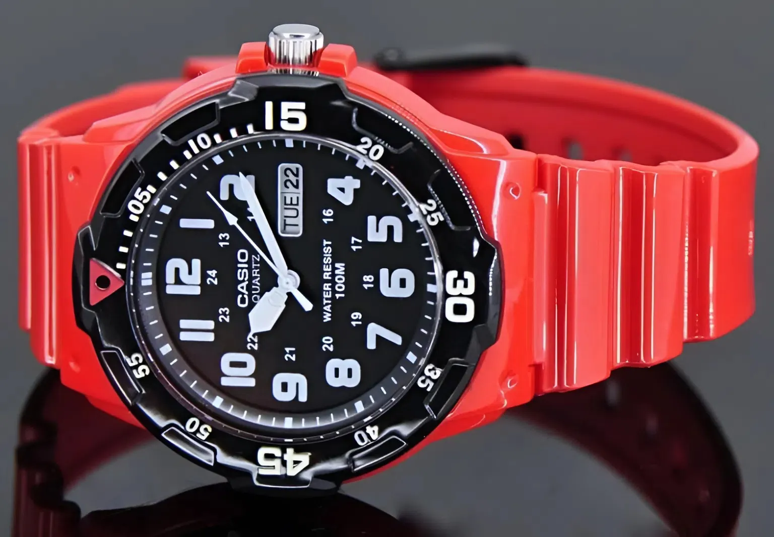 Sức hút lớn nhất của Đồng Hồ Casio 44.6mm Nam MRW-200HC-4BVDF nằm ở bảng màu "không dành cho số đông". Casio đã cực kỳ táo bạo khi sử dụng tông đỏ bóng (Glossy Red) cho toàn bộ phần vỏ và dây đeo.