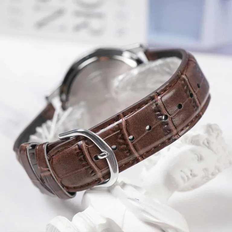 Dây da nâu vân cá sấu: Thay vì dây kim loại, Casio lựa chọn dây da màu nâu đất với các đường vân dập nổi. Điều này giúp cân bằng lại sự hầm hố của mặt số, mang đến vẻ lịch lãm, phong trần của một quý ông.