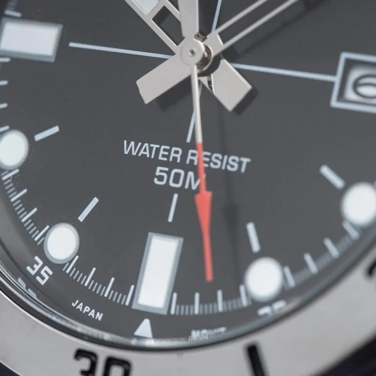 Mặt số (Dial) đen sâu thẳm: Tạo chiều sâu và sự cuốn hút. Các cọc số dạng vạch to bản cùng bộ kim được phủ lớp dạ quang, hỗ trợ bạn xem giờ trong điều kiện thiếu sáng.