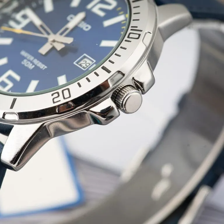 Điểm nhấn đầu tiên khiến Đồng Hồ Casio 45mm Nam MTP-VD01L-2BVUDF trở nên khác biệt chính là mặt số màu xanh dương Navy sâu thẳm. Sắc xanh này gợi lên sự tin cậy, chiều sâu và vẻ nam tính trưởng thành. Không đi theo lối mòn tối giản, phiên bản này sở hữu vòng bezel (vành băm) mạnh mẽ với các chữ số chỉ phút dập nổi, mang đậm hơi thở của những dòng đồng hồ lặn chuyên nghiệp.
