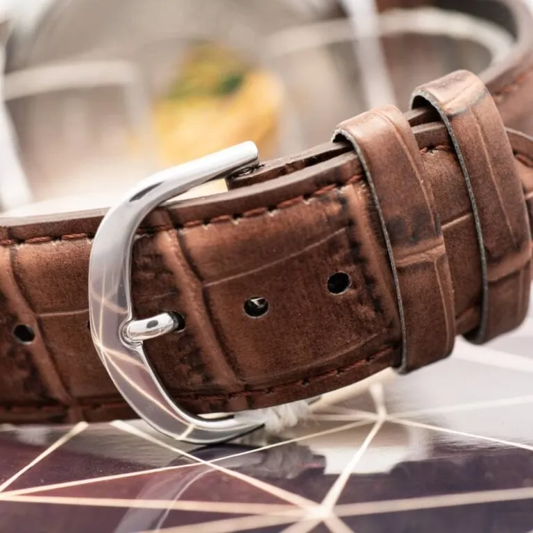 Dây da vân cá sấu: Phần dây da nâu được dập vân tinh tế, không chỉ bền bỉ mà còn ôm sát cổ tay, mang lại cảm giác êm ái khi đeo suốt cả ngày dài.